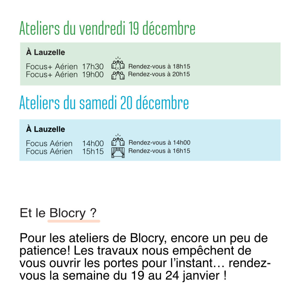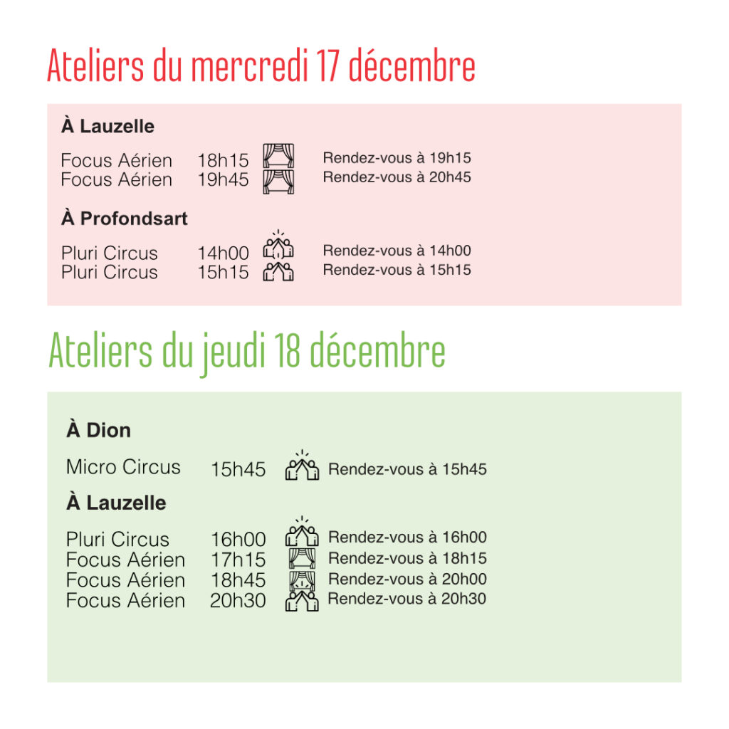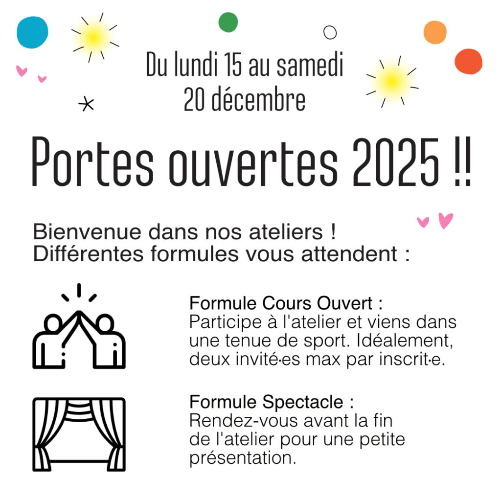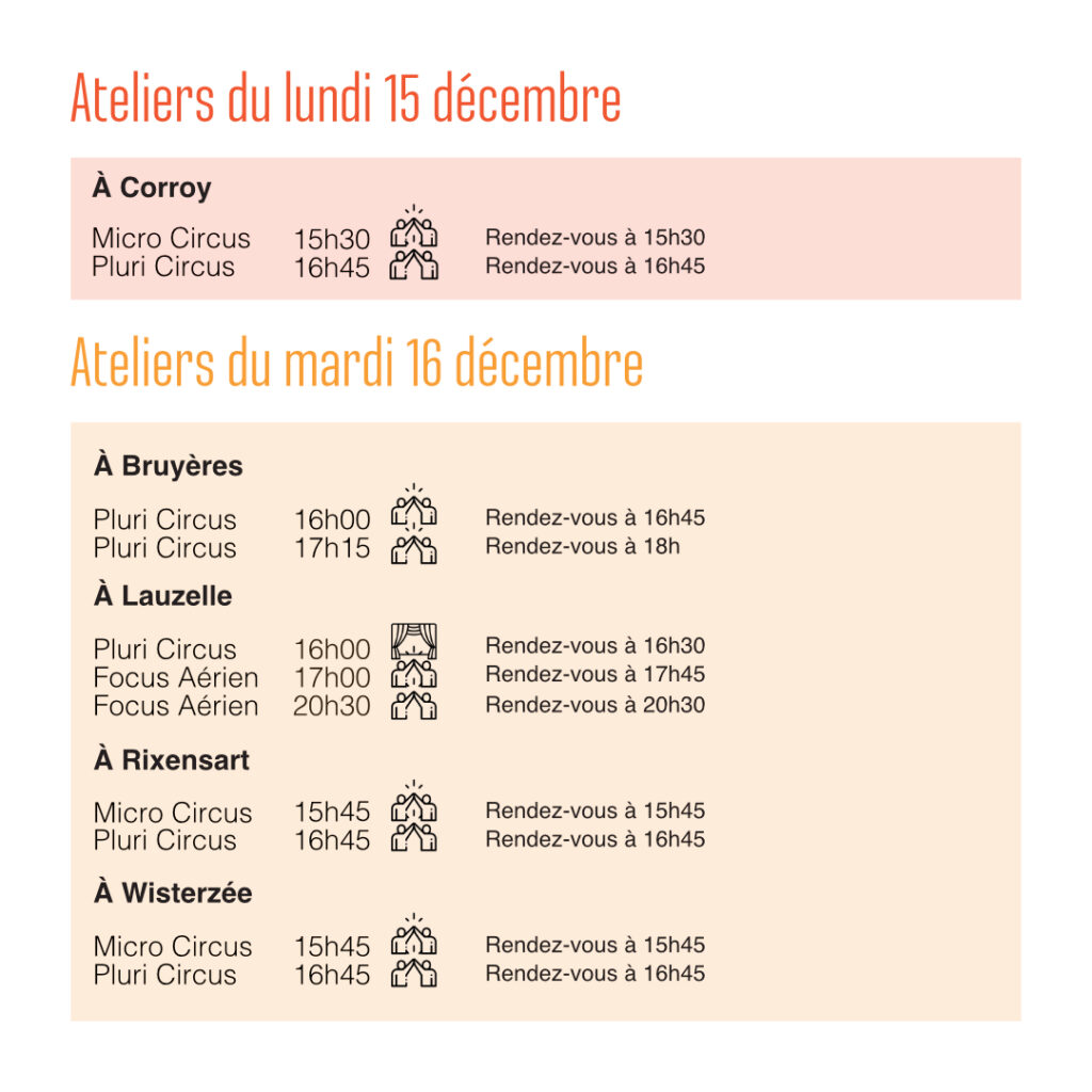 Les portes ouvertes des ateliers de l’École de Cirque du Brabant Wallon auront lieu du lundi 15 au samedi 20 décembre. Voici les horaires et modalités pour les différents ateliers :